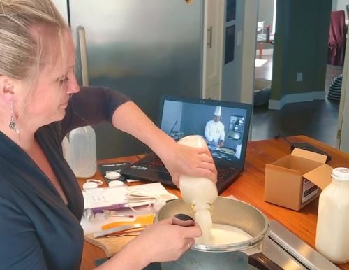 Each station needs one of our kits, a single burner (stove element), a 1 gallon+ pot, some common kitchenware, and most importantly… a gallon of milk*. For online sessions, a monitor and zoom application.